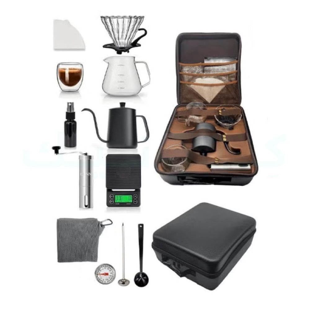 - المحتويات: 1. غلاية قهوة من الفولاذ المقاوم للصدأ 304 سعة 600 مل / 2. وعاء قهوة زجاجي سعة 600 مل / 3. مصفاة قهوة / 4. كوب قهوة سعة 250 مل / 5. مطحنة قهوة يدوية / 6. مرشحات قهوة / 7. ميزان قهوة / 8. ميزان حرارة قهوة / 9. ملعقة قهوة / 10. بخاخ / 11. منشفة تنظيف / 12. حقيبة سفر من البولي يوريثين